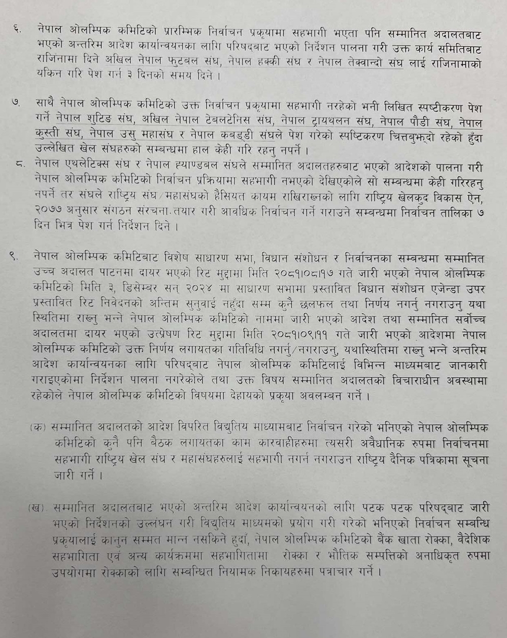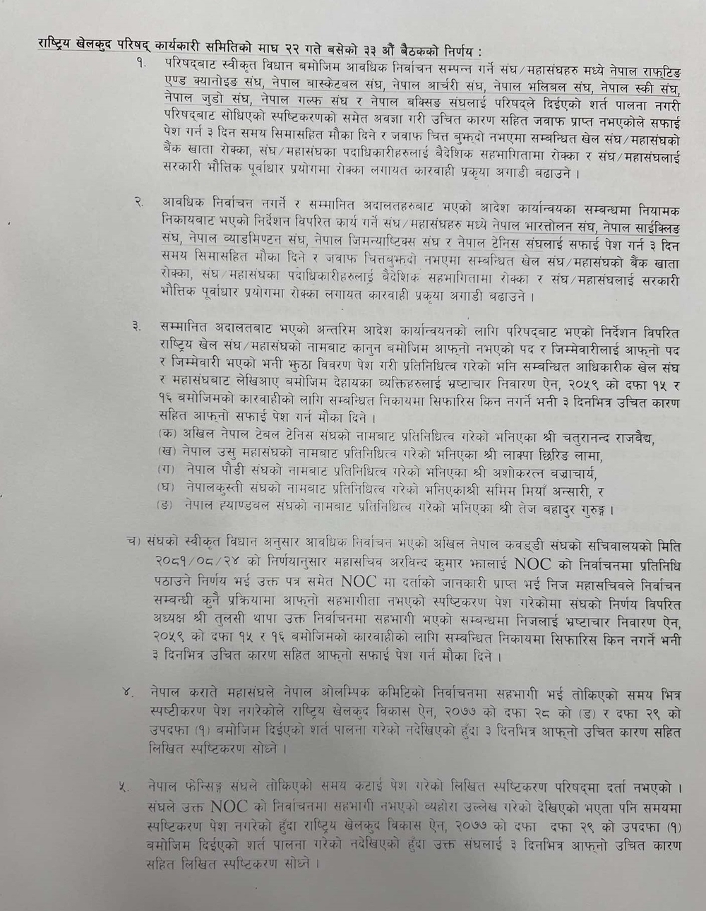 परिषदले नेपाल ओलम्पिक कमिटी (एनओसी)को निर्वाचनमा सहभागी भएका राष्ट्रिय खेल संघलाई तीन दिनभित्र चितबुझ्दो कारणसहित स्पष्टीकरण बुझाउन निर्देशन दिएको छ ।