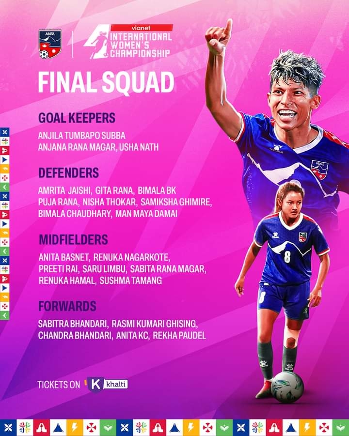 घोषित टिमको गोलरकिपरमा अन्जली सुब्बा, अञ्जना रानामगर र उषा नाथ छन् । यस्तै डिफेन्डरमा अमृता जैशी, गीता राना, विमल विक, पूजा राना, निशा थोकर, समीक्षा घिमिरे, विमला चौधरी र मनमाया दमाई छन् ।