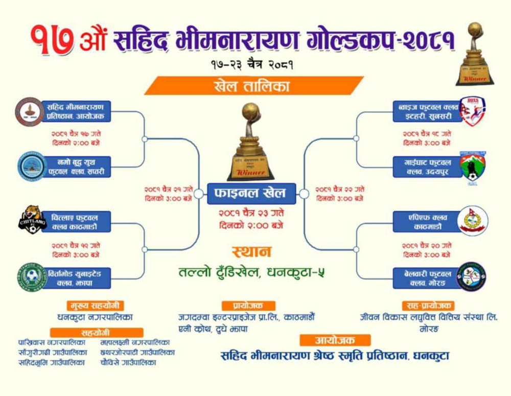According to the organizers, the game will start at 3 pm at Lower Tundikhel located in Dhankuta 5. The match on the first day of the tournament will be played between organizer Shahid Bhimnarayan Foundation Dhankuta and Namobuddha Youth Football Club Saptari. Eight teams including 'A' division will participate in the