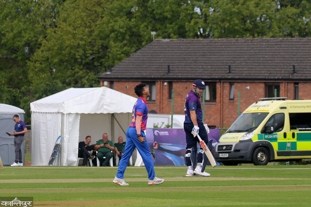 Karan KC caught Tier and Barrington behind the wicket in 2 consecutive overs. Matthew Cross and Finley McCreath put on another important partnership of 78 runs for the fifth wicket. Cross played 56 balls and hit 3 boundaries and was dismissed by Sandeep Lamichhane. McCreath scored 55 runs off 67 balls hitting 3 fours and 1 six.