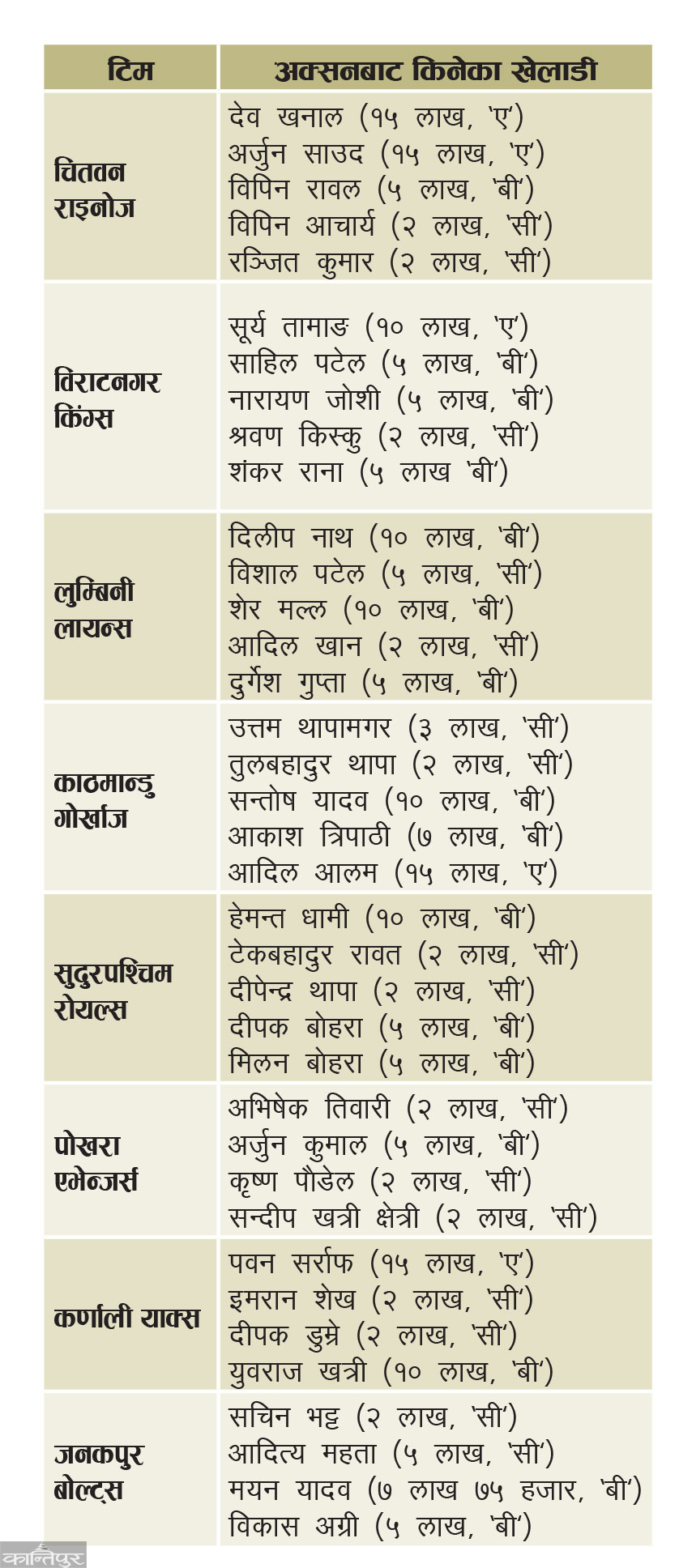 Kathmandu Gorkhaj spent 37 lakhs out of 43 lakhs he had. The highest spending team was Chitwan Rhinos. The team spent 3.9 million out of 58 savings. The team took Dev Khanal and Arjun Saud from the 'A' category for a maximum price of 15 lakhs. Chitwan, who was unlucky in the other lucky 'draw', picked Bipin Rawal for 5 and Bipin Acharya and Ranjit Kumar for 2 lakhs from the 'Wish List'.