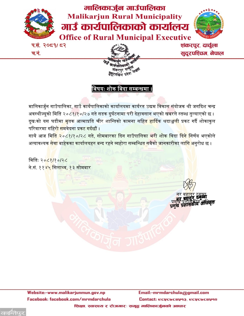 गाउँपालिकाका उद्यम विकास शाखा प्रमुख अवस्थीको मृत्यु भएपछि सोमबार गाउँपालिकामा शोक बिदा दिइएको प्रमुख प्रशासकीय अधिकृत ठगुन्नाले जानकारी दिए ।