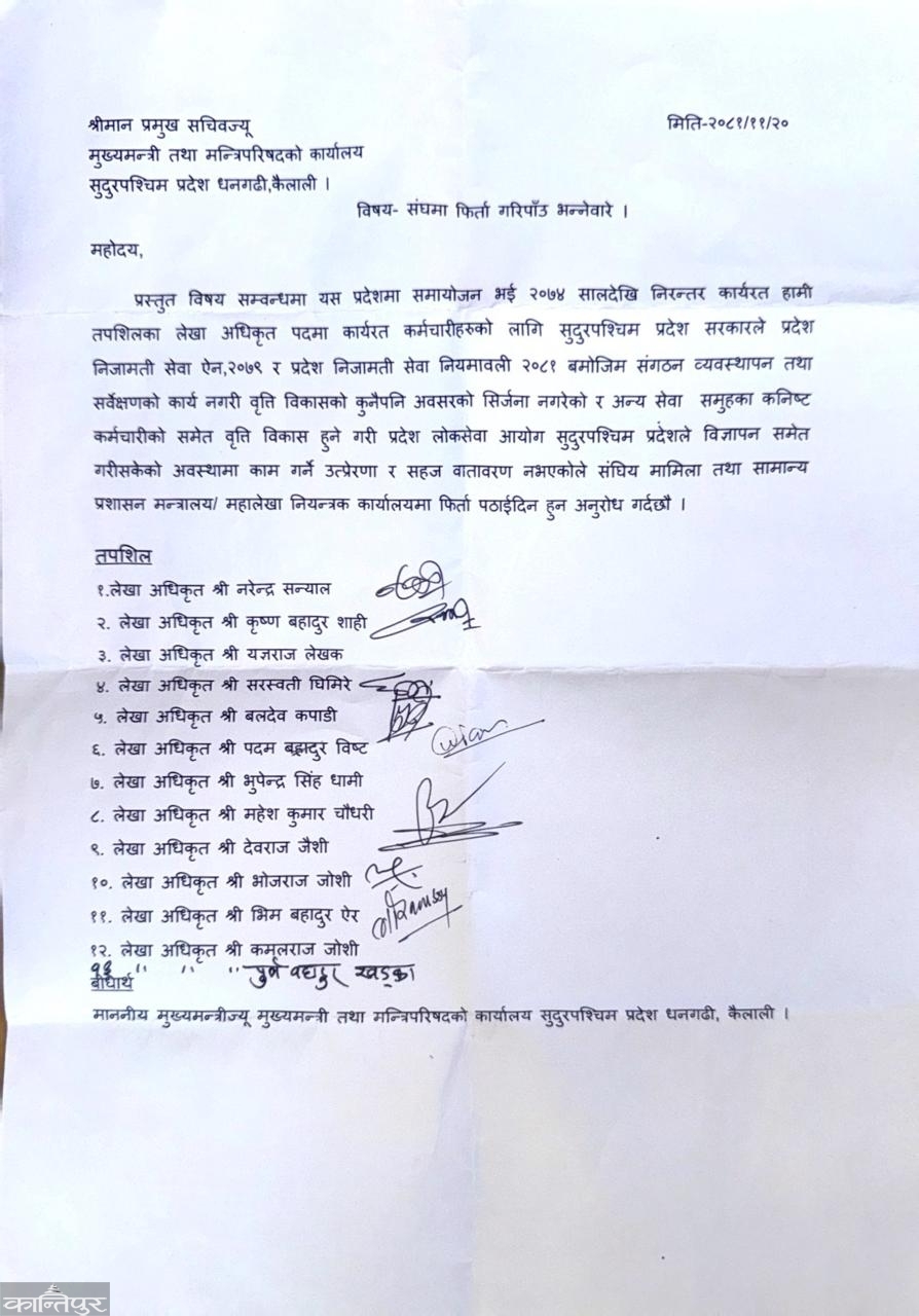सुदूरपश्चिम सरकारअन्तर्गत कार्यरत लेखाका कर्मचारीको वृत्ति विकासको ढोका बन्द गरिएको भन्दै उनीहरूले चरणबद्ध आन्दोलन गर्दै गएका थिए । यसै क्रममा बुधबारदेखि पुनः सुरु गरिएको आन्दोलनका क्रममा उनीहरूले प्रदेश सरकारद्वारा लेखा समूहका कर्मचारीको मागप्रति बेवास्ता गरिएको भन्दै संघमा फिर्ता गर्नुपर्ने माग अघि सारेका हुन् ।